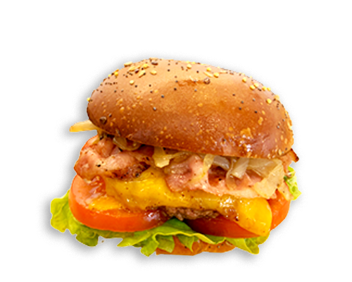 Pain Brioché, Sauce Burger, Salade, Tomates, Oignons cuits, Steack haché Charal Grand Cru 120 Gr, Poitrine fumé, Cheddar affiné